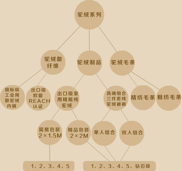 工业级驼绒分出口和内销两类。出口等级的本色驼绒有15个等级,内销有6个等级。驼绒的分等分级指标,一共有十几项,包含理化指标,环保,卫生,安全指标以及感官指标。每个等级颜色有黄褐色和浅白色两类。其中黄褐色的天然驼绒可按客户的特殊要求,脱色为淡黄色和亮白色,因为脱色为化学加工过程,对驼绒纤维有一定伤害并残留一定的化学成分,所以,只用于一些特殊的行业,一般不建议用于服装家纺产品,无论家用级还是工业级,均保证为100%驼绒,不含有其它任何化学纤维。